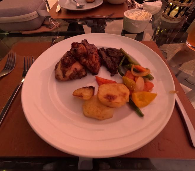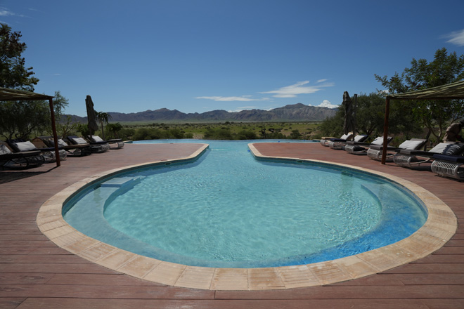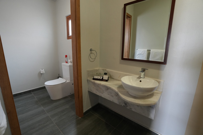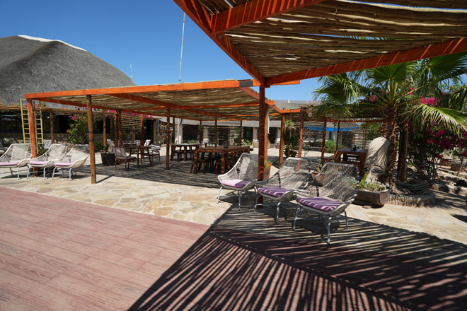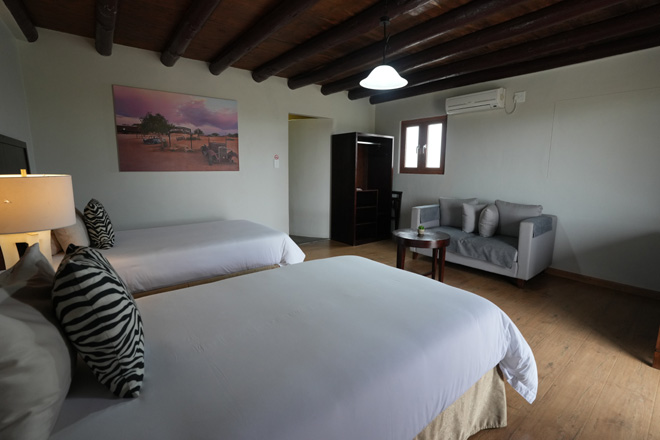 Each chalet has a solid deck, offering the option of sleeping under the sky or simply enjoying an elevated view. The chalet is equipped with A/C, two modern three-quarter beds, side tables with lamps, an open cupboard, and a long wall-mounted table, which can be used to place a suitcase or apply make-up.