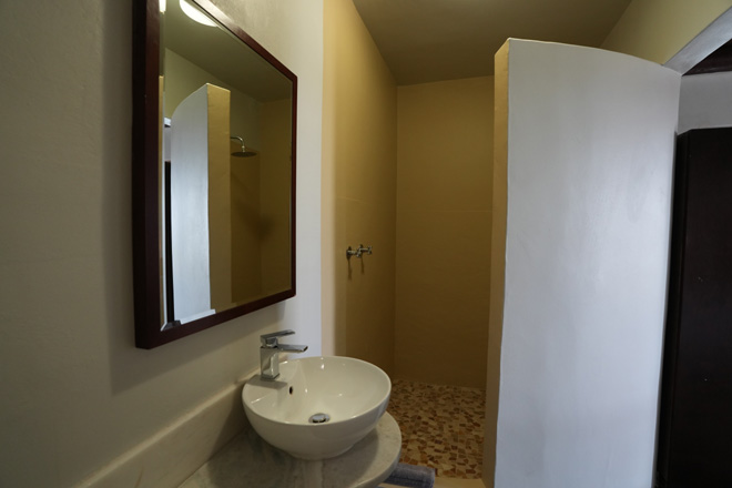 The bathroom features a large, spacious shower with a hand basin and mirror. The toilet is a separate facility, enclosed by a solid door.